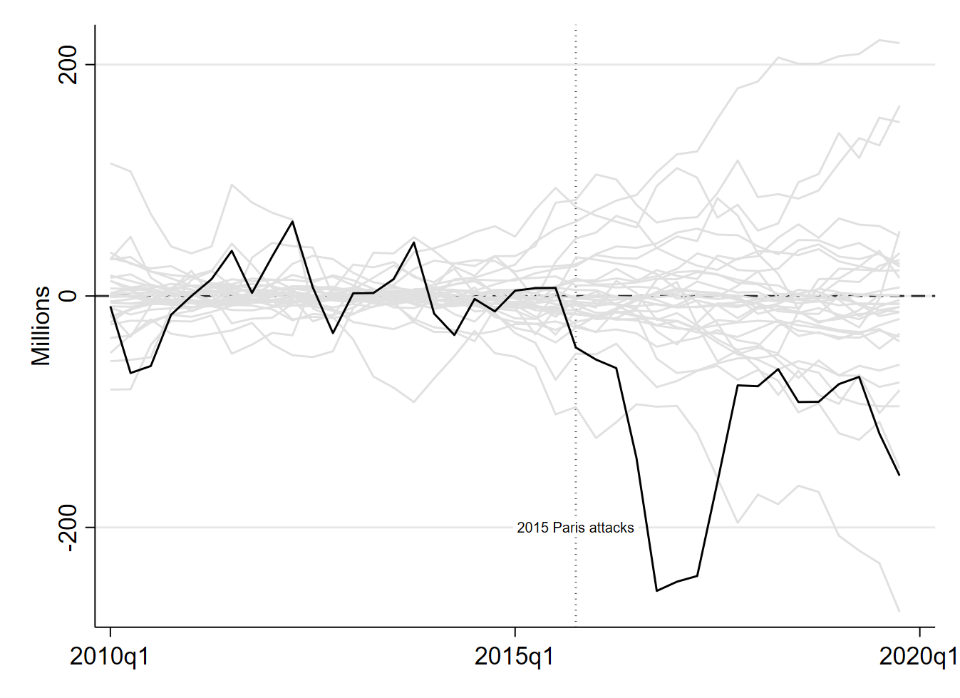 This paper examines the impact of the 2015 and 2016 terrorist attacks in France on the number of British tourists visiting the country. Using quarterly tourism outflow data from a select group of countries, both before and after the attacks, the study employs a synthetic control method to analyze the short- and long-term effects of these incidents.